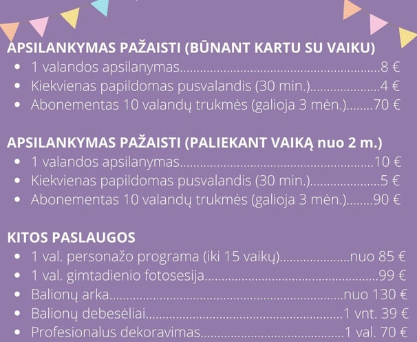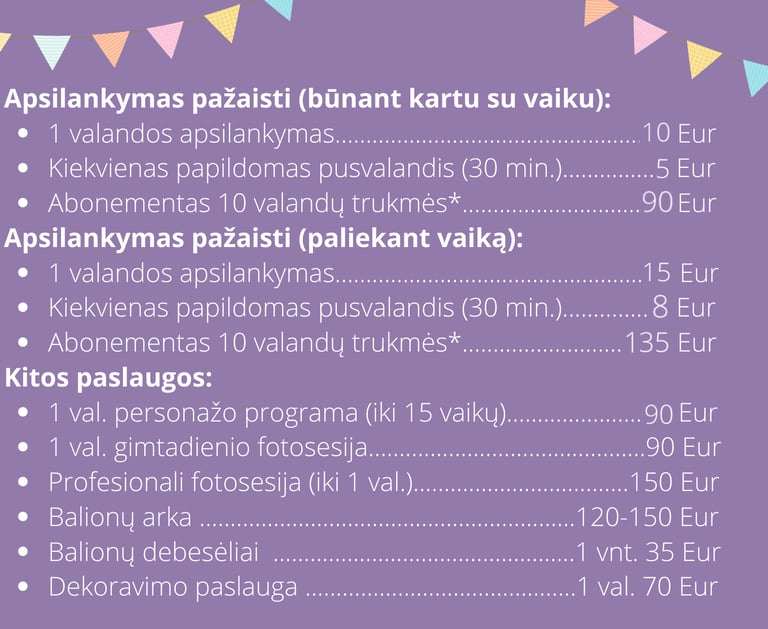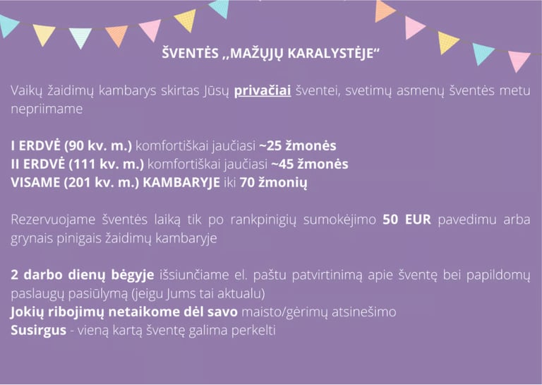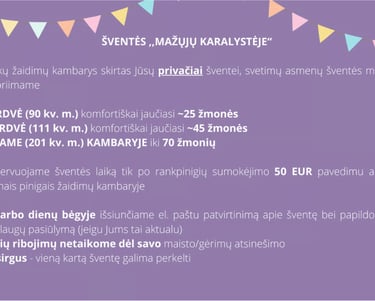 Šventinėmis ir nedarbo dienomis už “Mažųjų Karalystė” žaidimų erdvės nuomą taikomos (penktadienio - sekmadienio paslaugų kainos)